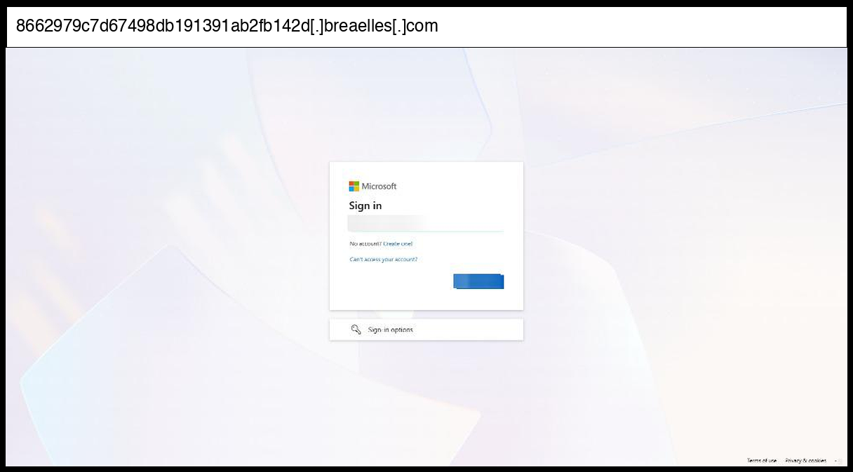 This phishing page employs a sophisticated Microsoft credential harvesting operation that uses form POST submission to "https://8662979c7d67498db191391ab2fb142d.breaelles.com/common/login" along with multiple fallback endpoints for different authentication flows. The most significant TTPs observed include extensive brand impersonation with authentic-looking Microsoft login interface elements, comprehensive evasion techniques through multiple obfuscated configuration objects containing encoded state parameters and complex redirect chains, and advanced infrastructure setup using the suspicious "breaelles.com" domain with multiple subdomains that mimic legitimate Microsoft services.