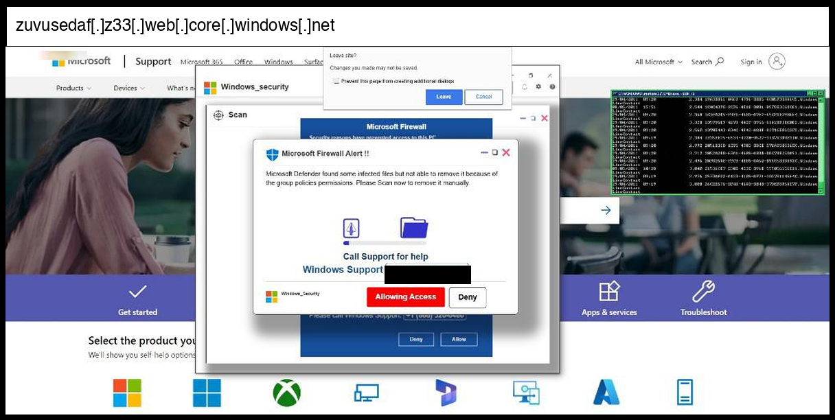 The social engineering approach mimics Windows Defender security alerts with fake threat detection counters, animated scanning progress bars, and displays a phone number (+1 866 520-0480) for fraudulent "Windows Support," while the infrastructure leverages Microsoft Azure blob storage (z33.web.core.windows.net) for hosting. The sophistication level is advanced due to the client-side encryption scheme that likely evades static analysis tools and the comprehensive browser manipulation techniques designed to trap victims in a fake security alert scenario, though the actual credential capture mechanism remains hidden within the encrypted payload that couldn't be fully analyzed without the proper decryption key.