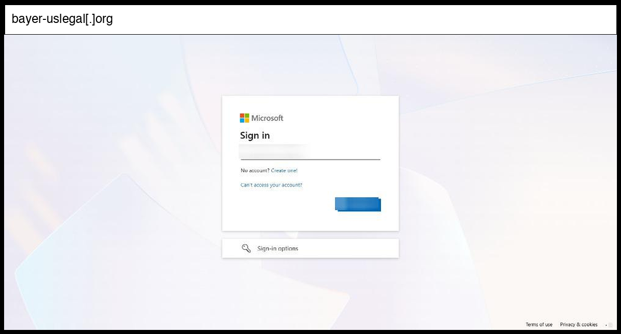 This phishing page uses a standard HTML form POST to "/common/login" to capture credentials, but employs sophisticated Microsoft authentication interface mimicry by loading legitimate Microsoft CDN resources (aadcdn.msftauth.net) and replicating the exact visual appearance and JavaScript functionality of genuine Microsoft login pages. The site is hosted on the suspicious domain "bayer-uslegal.org" which impersonates the pharmaceutical company Bayer while masquerading as a legal services subdomain, and implements extensive JavaScript obfuscation through encoded configuration objects and complex authentication workflows that mirror real Microsoft OAuth 2.0 flows. The sophistication level is advanced, featuring real-time DNS prefetching to legitimate Microsoft domains, comprehensive browser fingerprinting capabilities, Watson error reporting integration, and dynamic content loading that makes detection challenging - this appears to be a professional phishing kit designed to harvest Microsoft 365 credentials with high fidelity interface replication.