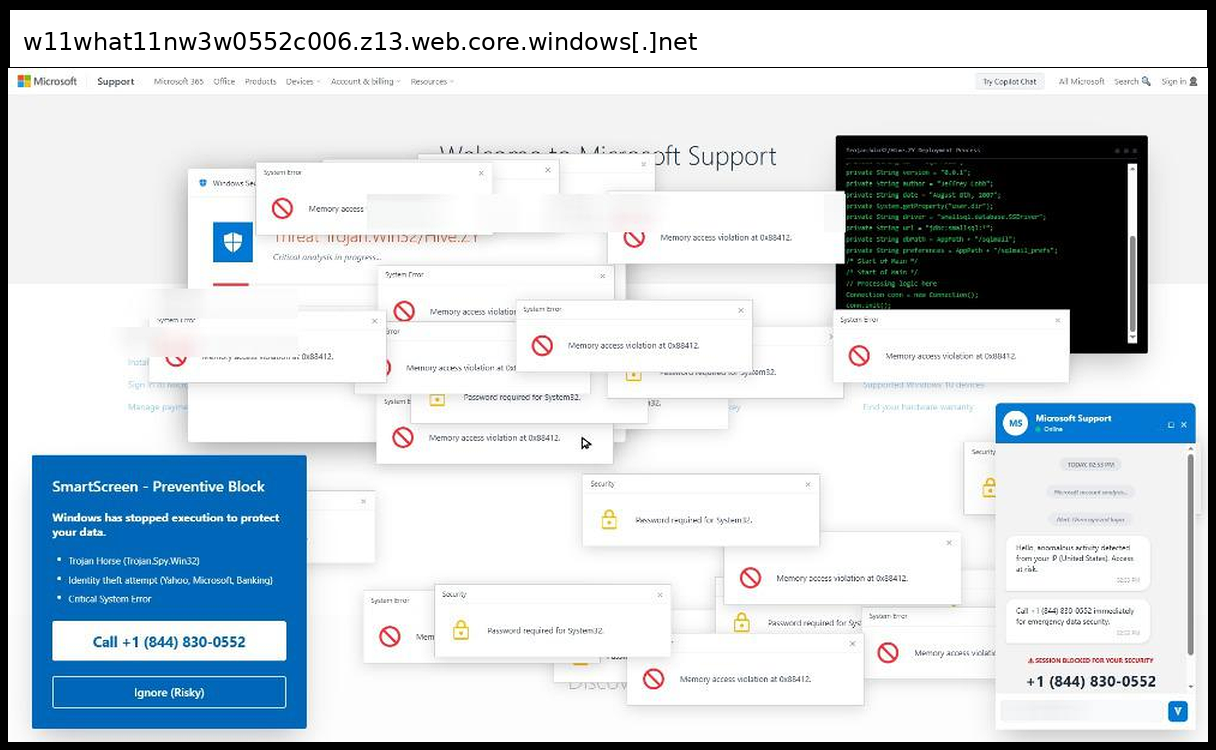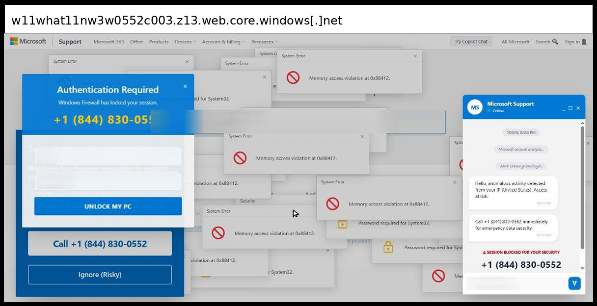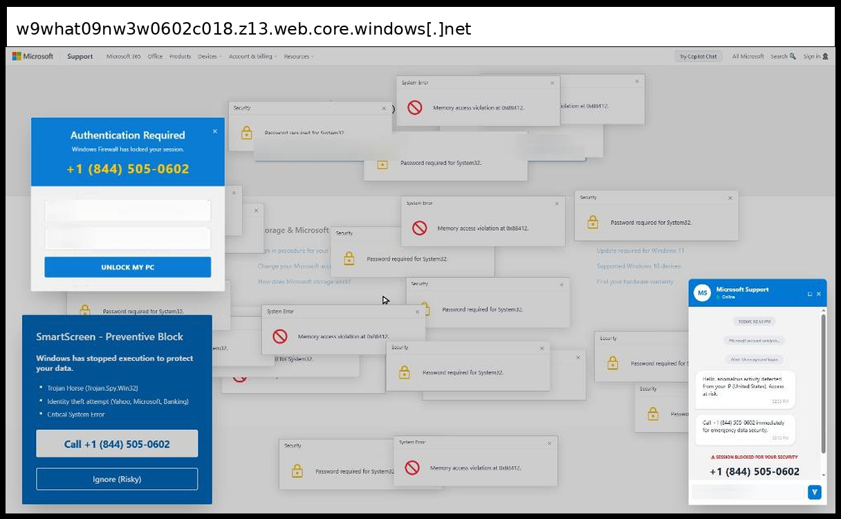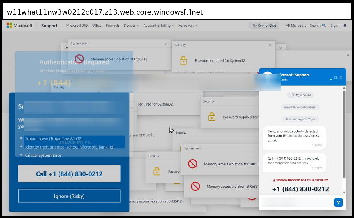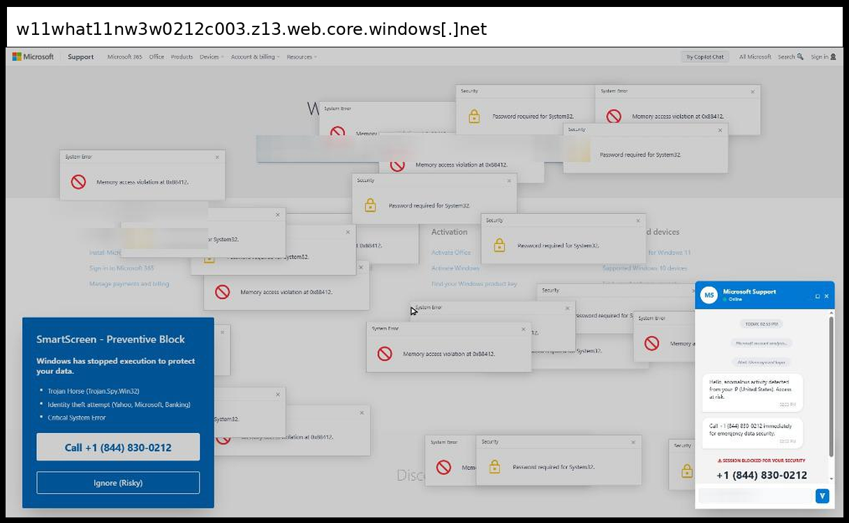 This phishing page uses a sophisticated multi-layered social engineering approach that primarily relies on phone-based credential collection rather than traditional form submission, with victims directed to call +1 (844) 830-0212 for "emergency data security" through fake Microsoft Support chat windows and authentication dialogs. The page employs advanced visual manipulation techniques including multiple overlapping fake Windows error popups ("Memory access violation", "Password required for System32"), a convincing Microsoft Support interface replica with disabled input fields to force phone contact, and integrated Tawk.to live chat functionality to appear legitimate.