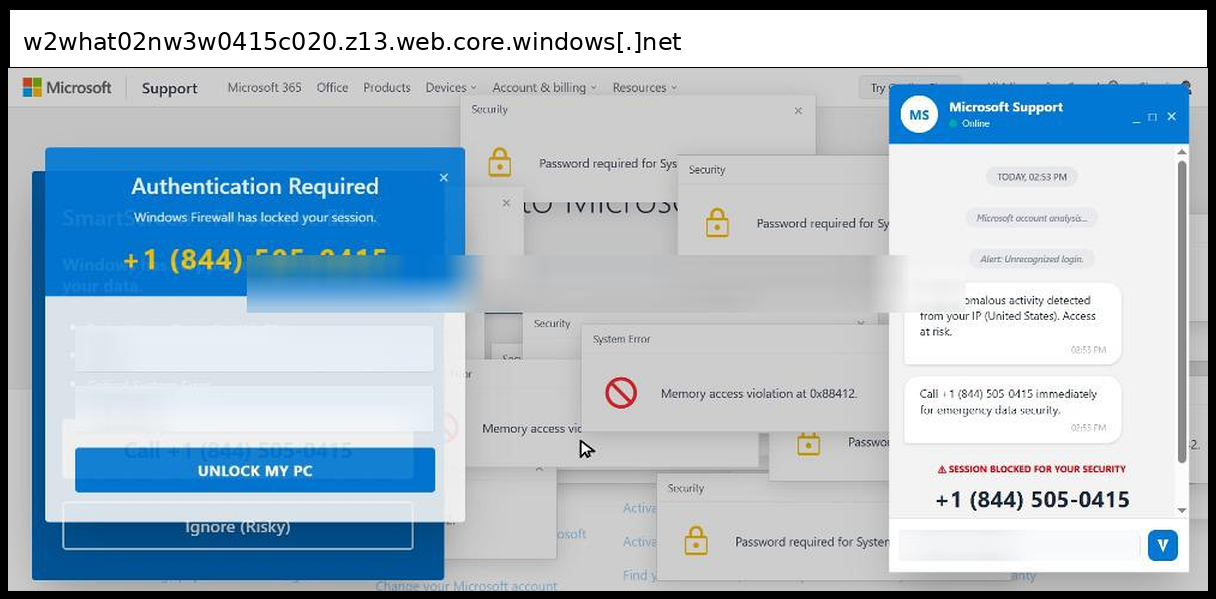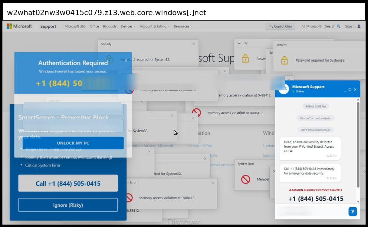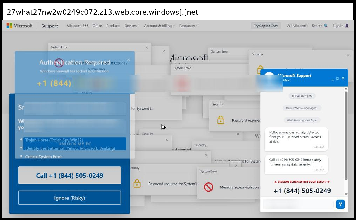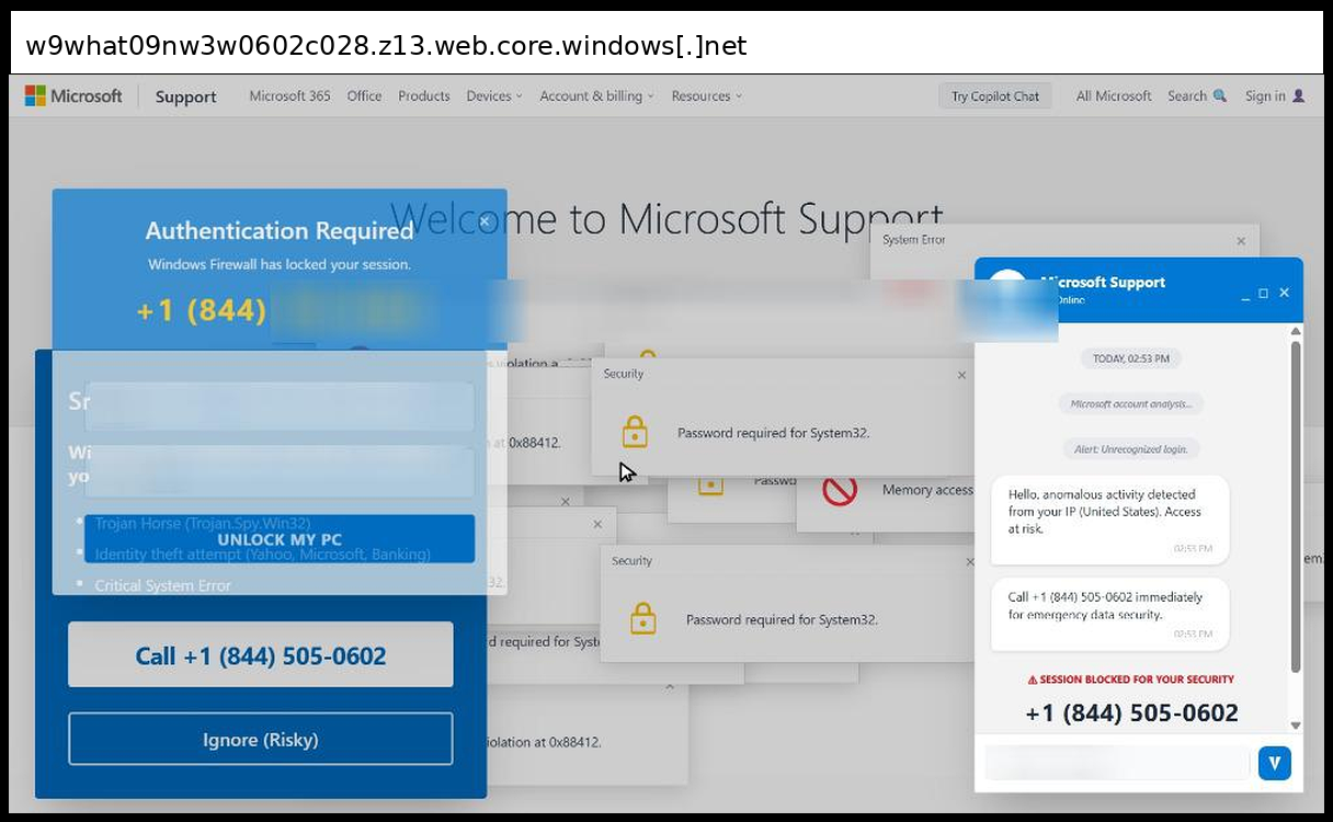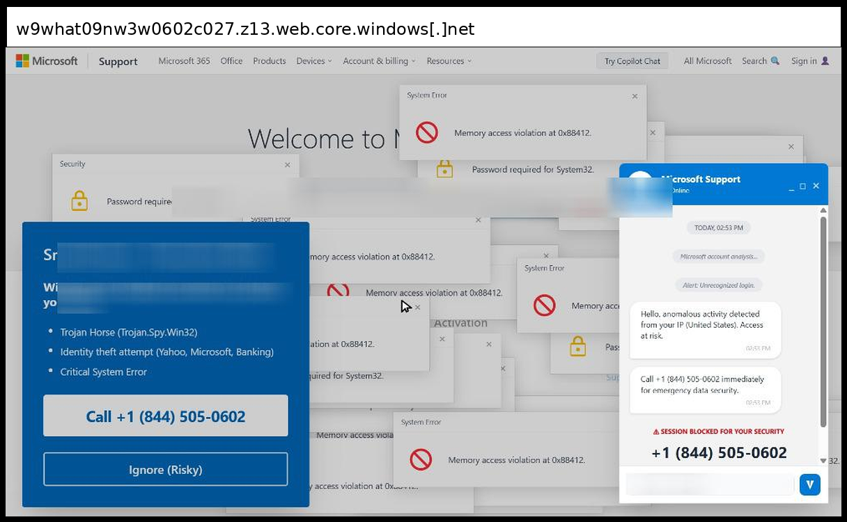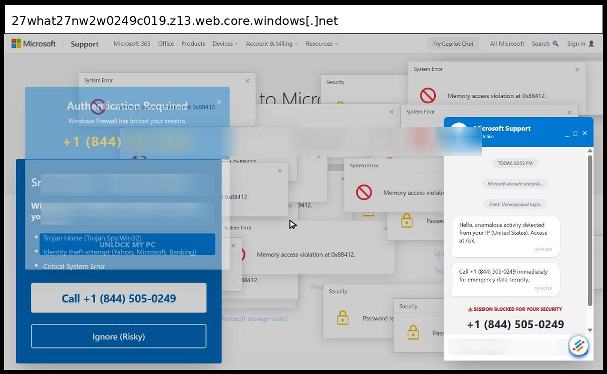 This phishing page uses a sophisticated multi-layered social engineering approach that primarily relies on phone-based credential collection rather than traditional form submission, with victims directed to call +1 (844) 830-0212 for "emergency data security" through fake Microsoft Support chat windows and authentication dialogs. The page employs advanced visual manipulation techniques including multiple overlapping fake Windows error popups ("Memory access violation", "Password required for System32"), a convincing Microsoft Support interface replica with disabled input fields to force phone contact, and integrated Tawk.to live chat functionality to appear legitimate.