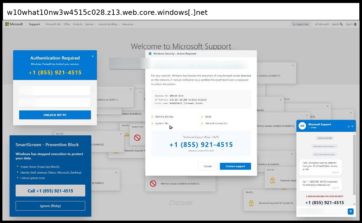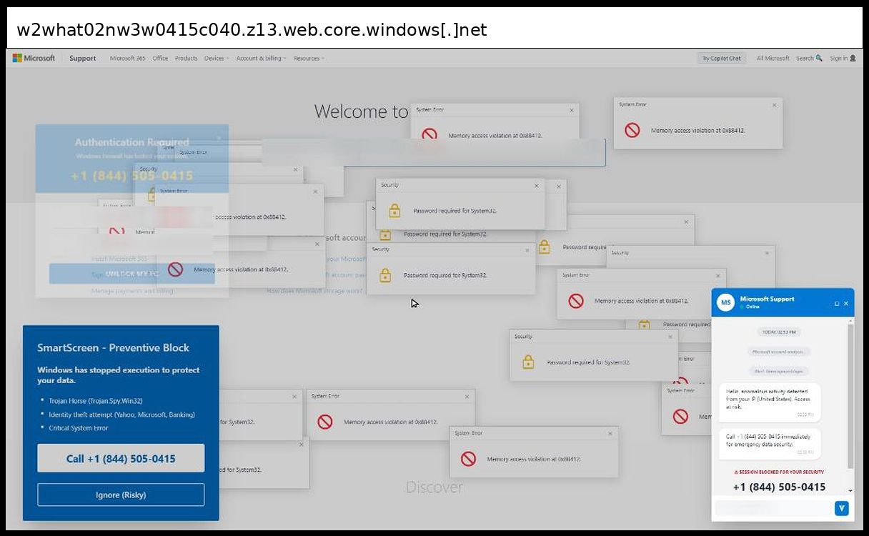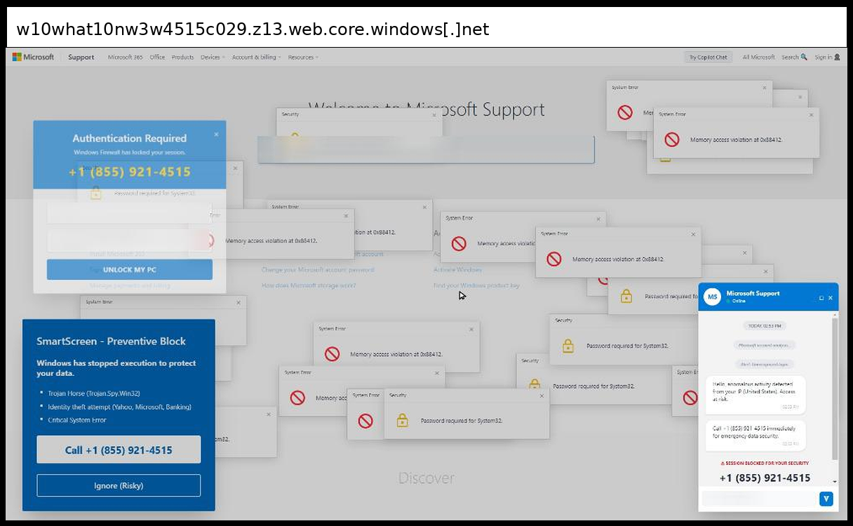 Between February 26, 2026 and March 11, 2026, analysts identified a significant shift toward sophisticated social engineering campaigns, with the majority of incidents employing tech support scams that bypass traditional credential harvesting in favor of phone-based fraud operations. A notable pattern emerged across multiple incidents utilizing Microsoft Azure hosting infrastructure (z13.web.core.windows.net) combined with legitimate services like Tawk.to chat widgets to create convincing Microsoft Support impersonation pages that display fabricated system errors ("Memory access violation," "Password required for System32") and security alerts to pressure victims into calling scammer phone numbers rather than submitting credentials through web forms.