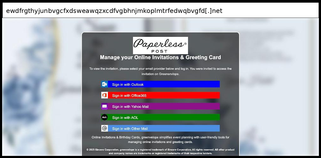 This phishing page uses a multi-stage credential capture technique that initially submits email/password combinations via AJAX POST to "processmail.php", then deliberately displays an "Incorrect Password" error on the first attempt to enhance credibility before proceeding to collect OTP codes through a second form that posts to "process.php". The campaign impersonates Adobe and Greenvelope invitation services while spoofing multiple major email providers (Outlook, Office365, Yahoo, AOL) through a single interface, using professional branding with blurred background images and legitimate-looking modal dialogs to build trust.
