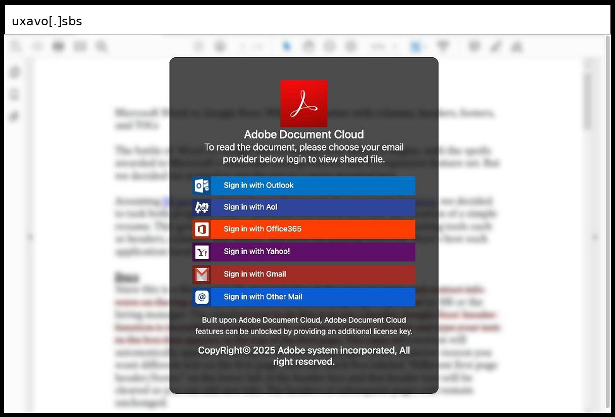 The infrastructure appears to be hosted on a suspicious domain "uxavo.sbs" which is likely a disposable or compromised hosting service, and the page includes standard evasion techniques such as a content security policy and referrer meta tag set to "no-referrer" to limit tracking. The sophistication level is basic to moderate, representing a typical credential harvesting operation that relies primarily on visual deception and brand impersonation rather than advanced technical measures, though the clean professional appearance and proper form structure suggest some effort was made to avoid detection by security filters.