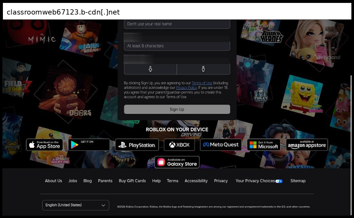 This appears to be a sophisticated phishing page that uses URL encoding/obfuscation through what looks like an Ultraviolet proxy service (classroomweb67123.b-cdn.net) to create a convincing Roblox clone, with all legitimate Roblox URLs being systematically rewritten through the proxy using encoded paths like "hvtrs8%2F-wuw%2Crmbnoz.aoo" (decodes to "https://www.roblox.com"). The page implements comprehensive brand impersonation by preserving authentic Roblox metadata, CSS styling, JavaScript bundles, and even maintains proper social media tags and SEO elements to appear legitimate, while the actual credential capture mechanism would likely occur when users attempt to log in through the proxied authentication forms that would POST to the attacker-controlled proxy rather than legitimate Roblox servers.