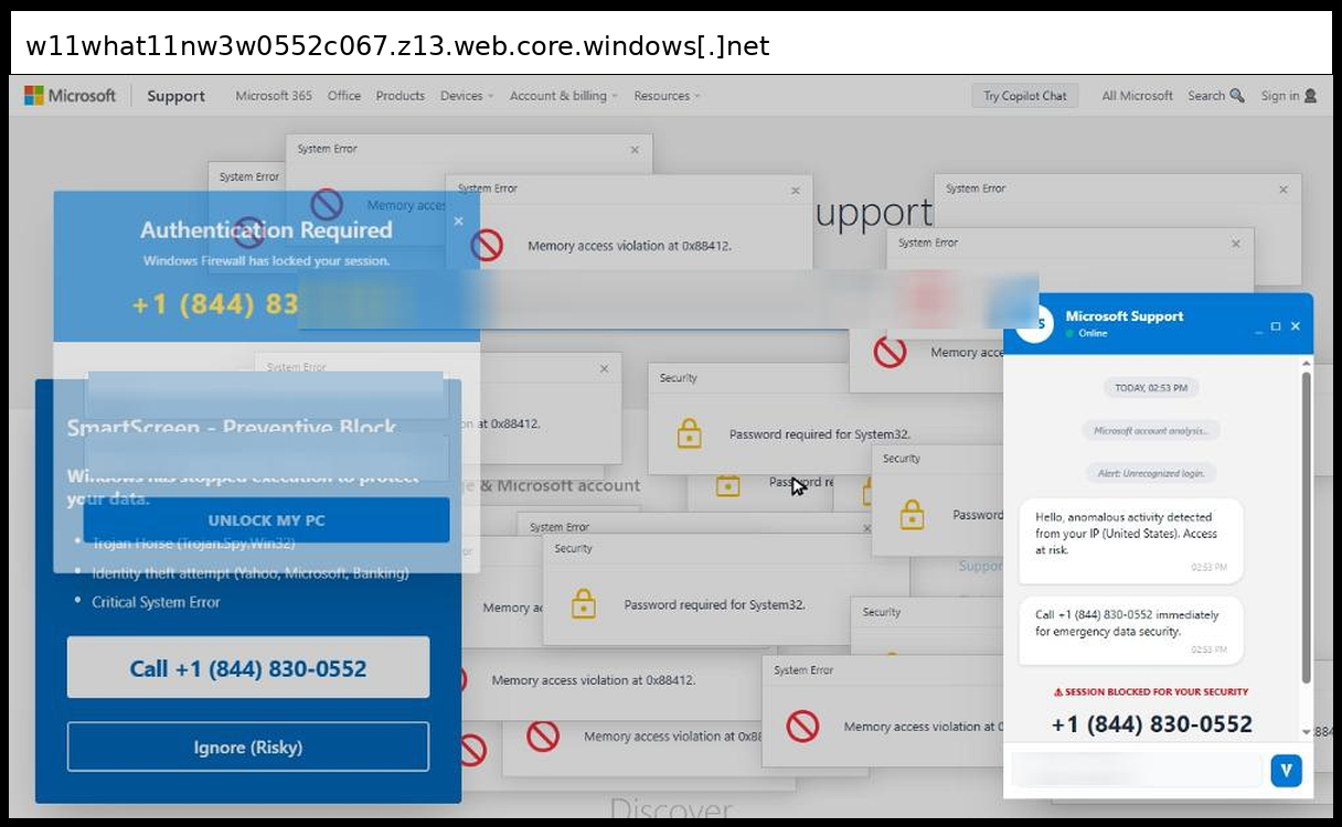 This phishing page primarily uses social engineering rather than credential capture, employing a tech support scam that displays fake security alerts claiming "anomalous activity detected" and "Session blocked for your security" while prominently featuring the phone number +1 (844) 830-0552 throughout multiple fake modal windows and a chat interface. The page utilizes legitimate Azure hosting (z13.web.core.windows.net) and incorporates sophisticated visual deception techniques including multiple overlapping fake Windows security dialogs with messages like "Password required for System32" and "Memory access violation," a realistic Microsoft Support chat widget powered by Tawk.to, and disabled form inputs that prevent actual credential submission while maintaining the illusion of functionality.