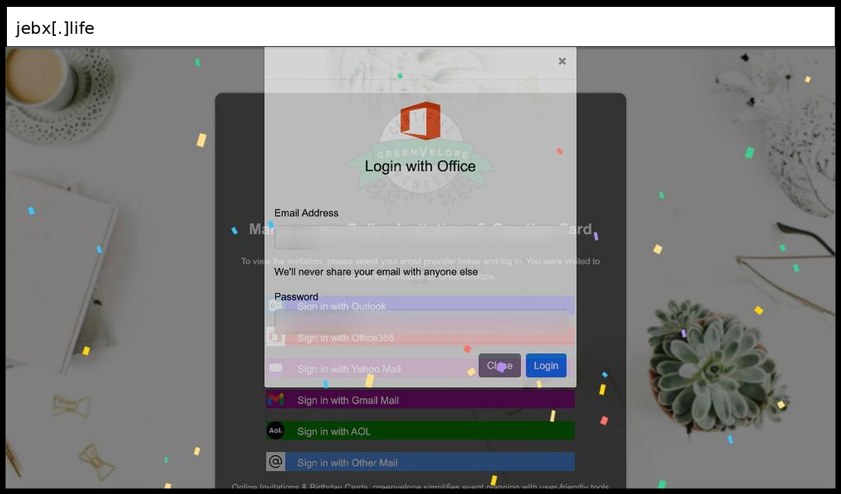 This phishing page implements a multi-stage credential capture system that initially submits login credentials via AJAX POST to "processmail.php" and then collects OTP tokens through a second form posting to "process.php". The attack employs sophisticated social engineering by impersonating Adobe/Greenvelope invitation services with multiple email provider options (Outlook, Office365, Yahoo, AOL), includes visual deception through confetti animations and branded logos, and uses a deliberate "incorrect password" error message on first submission to make victims retry with their actual credentials.