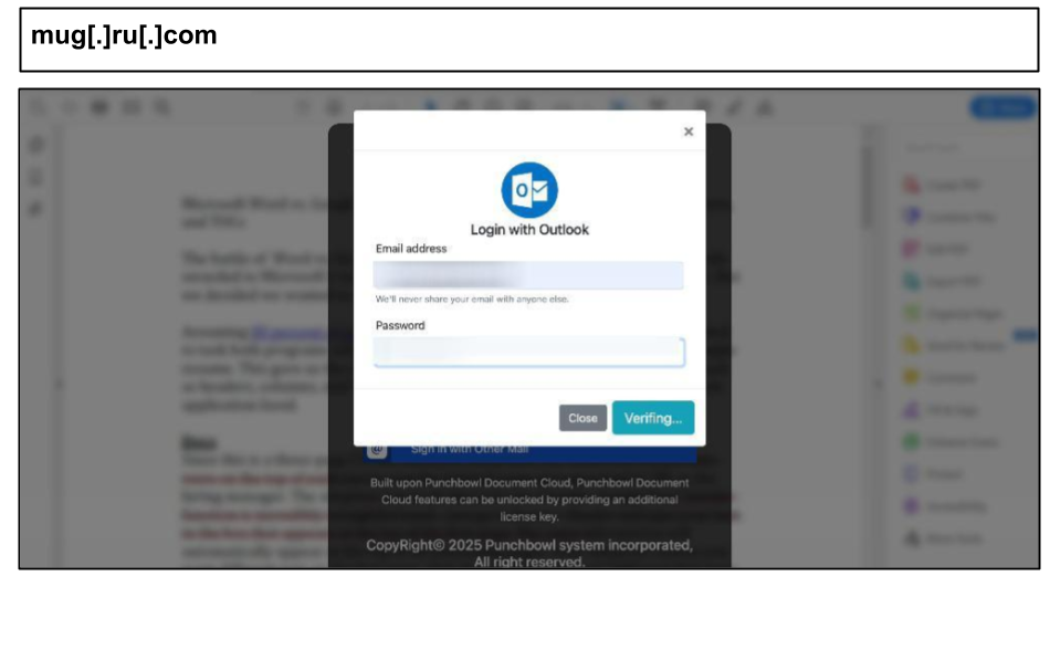 The page content includes classic document share lures: “Shared file”, “verify the professional business email the document was sent to”, “confidential PDF” etc. This case explicitly populated the victim’s email address on the login page. The “accountancy” reference in the subdomain suggests perhaps targeting accounting personnel. It included a full baked MFA relay kit, including options for “Approve request,” call, SMS, code from Authenticator.