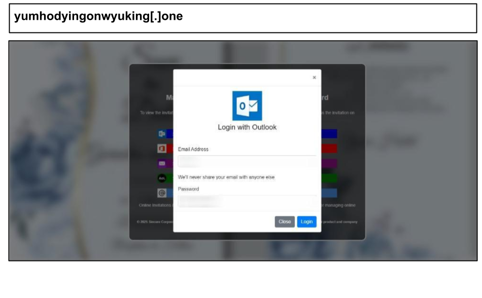 This one uses an online invite lure (eg. Paperless Post, Greenvelope etc.) to "view the invitation". Similar to others of this type, it offers the user multiple login options and a fake MFA flow.